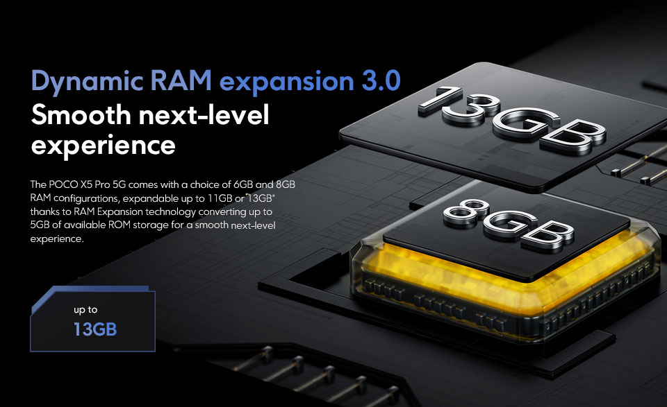 POCO X5 Pro 5G jest dostępny w konfiguracjach z 6 GB i 8 GB pamięci RAM, z możliwością rozszerzenia do 11 GB lub 13 GB* dzięki technologii RAM Expansion, która konwertuje do 5 GB dostępnej pamięci ROM, zapewniając płynne wrażenia na wyższym poziomie.